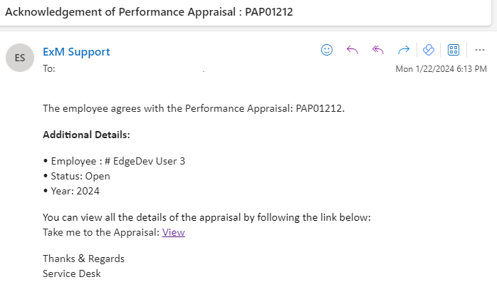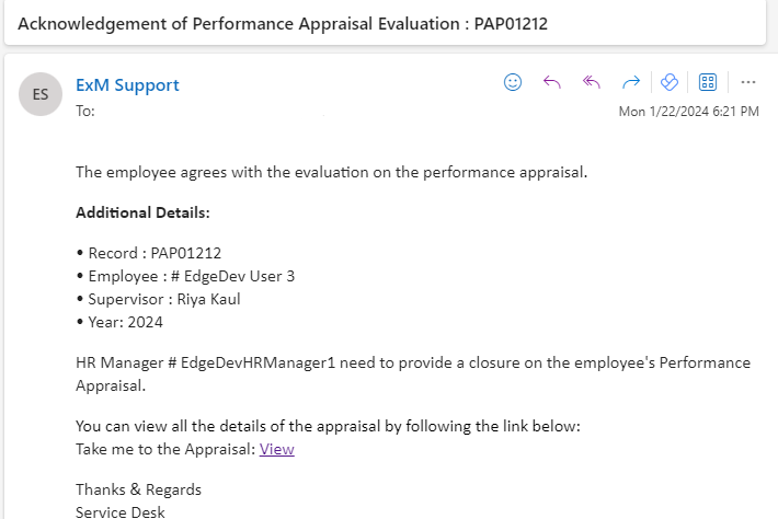 In case employee agree/disagree with the evaluation provided in the performance appraisal, an email/teams notification is sent to the Manager, HR Manager, Employee.