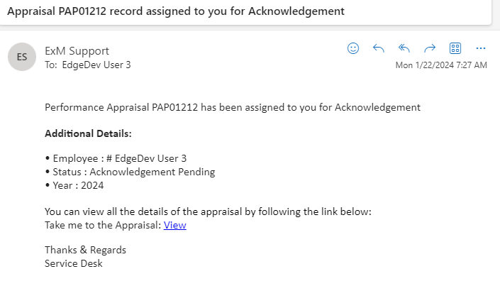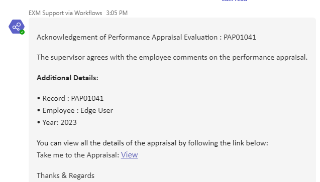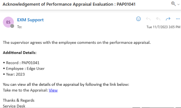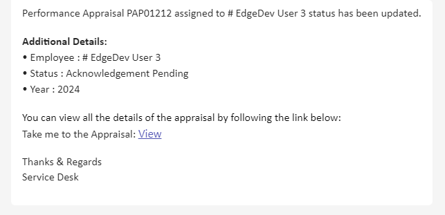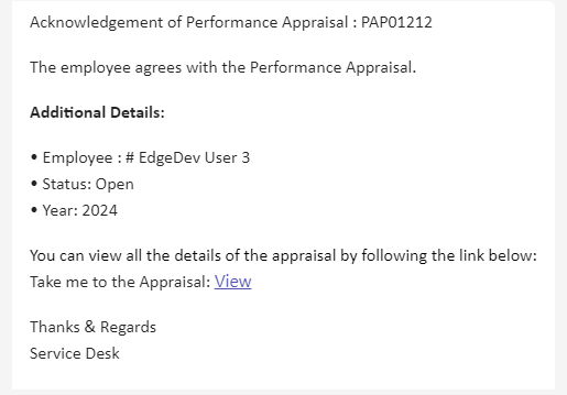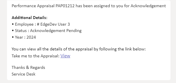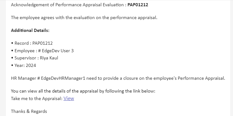 An email/teams notification is sent to the HR Manager, Manager on the Employee Acknowledgement of the Performance Appraisal.