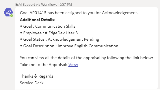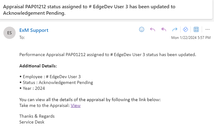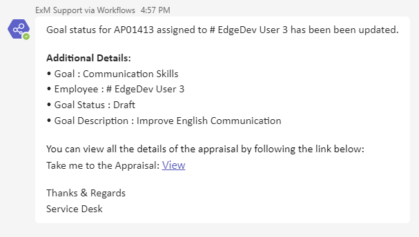 An email/teams notification is sent to the Employee, HR Manager, Manager for status update in Performance Appraisal except for Draft status. For Draft status, creation notification is sent to manager.