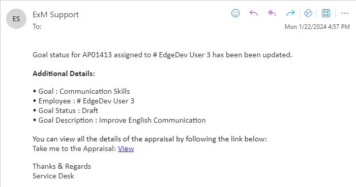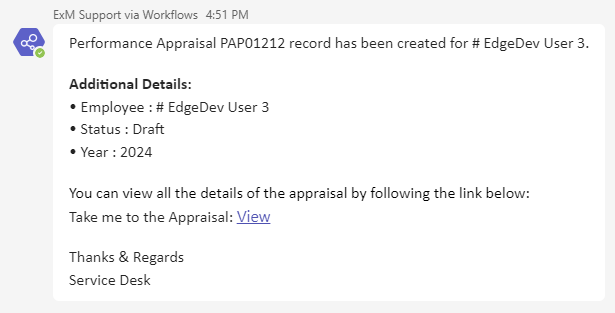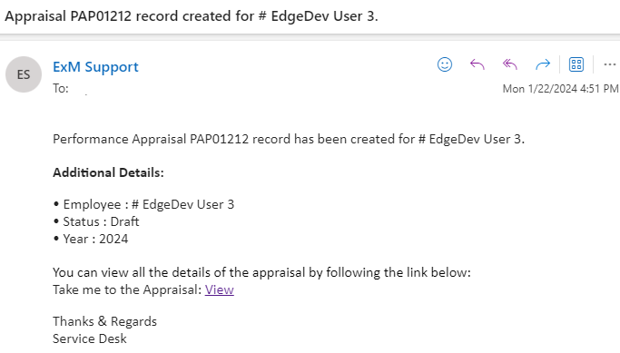 An email/teams notification is sent to the Manager for Performance Appraisal creation on Draft status.
