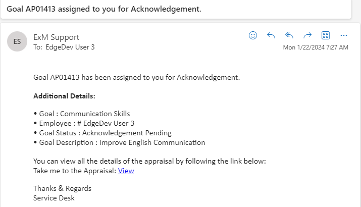 For Acknowledgement Pending status, the Goal Assignment notification is sent to employee.