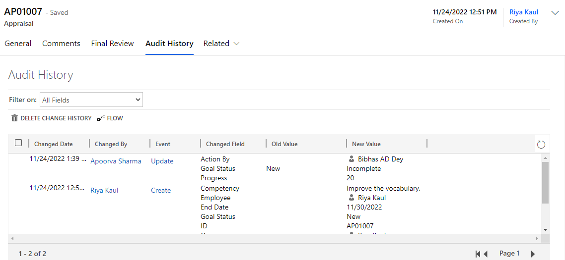 Any changes/updates made to the record will be captured in the audit history tab. The person who made the changes will be captured along with the time and the updated fields.
