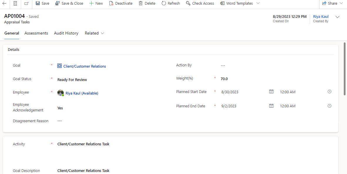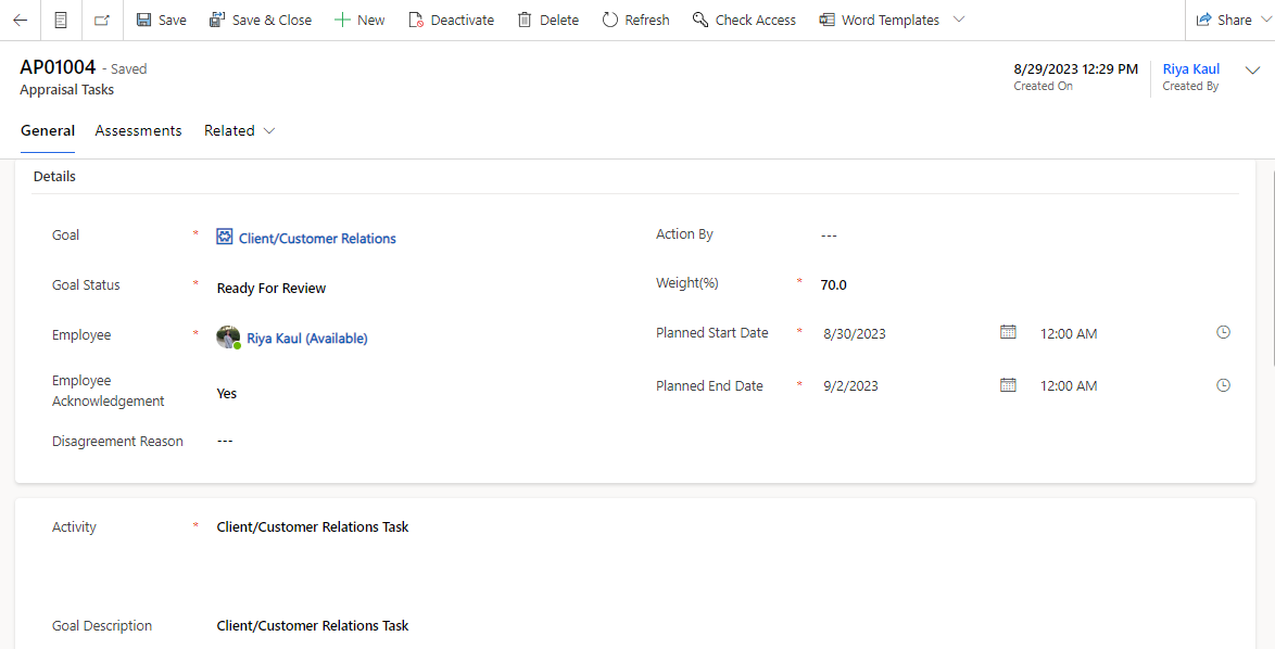 | Activity | The task under the particular goal to be completed by the employee. |