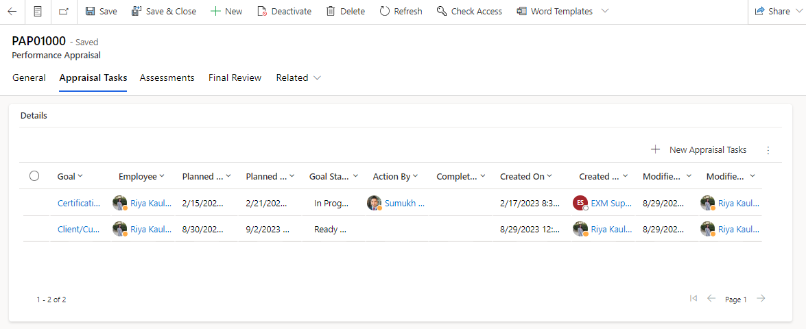 | Manager Assessment | Captures the Manager comments for the assessment of the Appraisal tasks. |