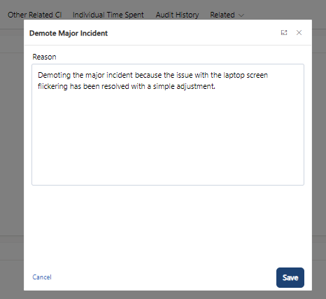 Upon clicking the Demote Major Incident button, a popup will prompt you to provide a reason for rejecting the Major Incident, ensuring transparency and documentation of the decision.