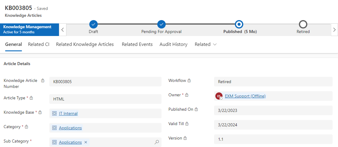 The EXM platform seamlessly incorporates Knowledge Management to aid in incident investigation, diagnosis, and resolution. Following the resolution of an incident, the Knowledge Fulfiller can generate a knowledge article directly from the incident by selecting a button in the top ribbon.