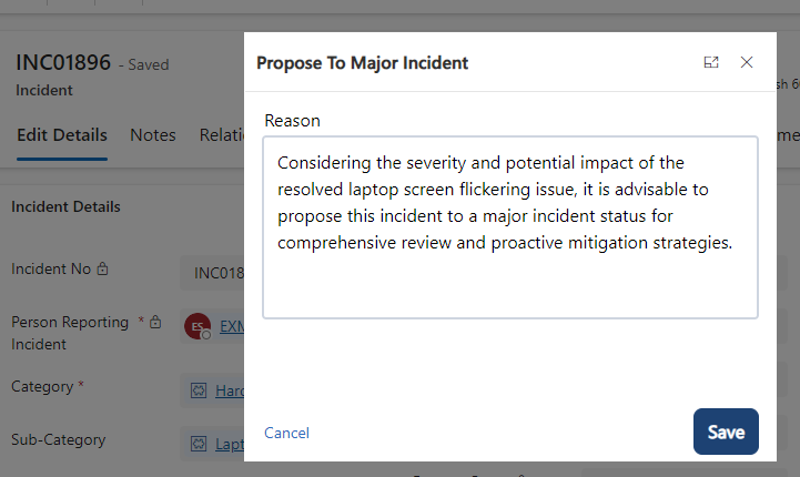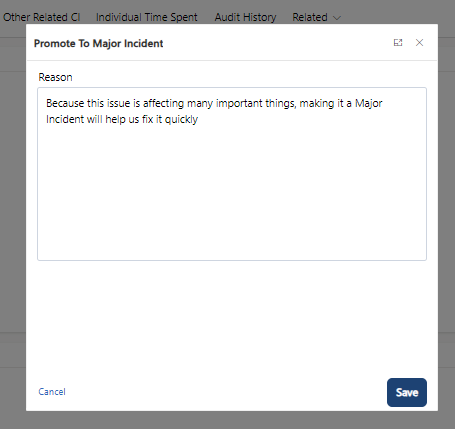 Promoting a Major Incident means recognizing a serious problem that needs urgent attention and extra resources to fix it quickly and minimize its impact on operations.Click the Promote Major Incident button located on the top ribbon to escalate critical issues for urgent attention and enhanced resource allocation.