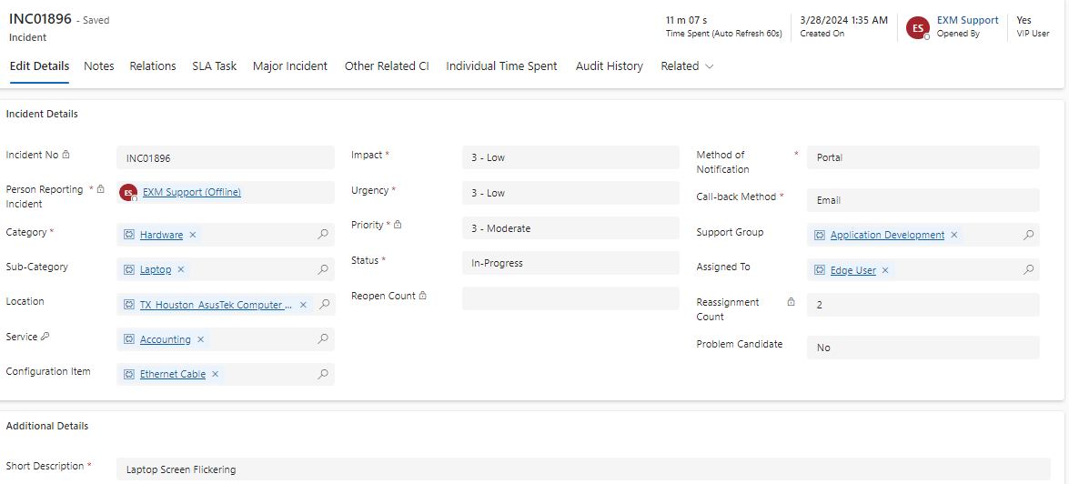 | Reassignment Count | Number of times the Support Group has changed. Reassignment Threshold: After a specific count of Reassignment, an email/Teams notification will be sent out to a group that can be configured from System properties, with the Incident details captured. |