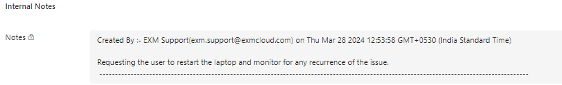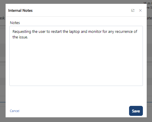 Admin can add internal notes by clicking on the button on the top ribbon. Special instructions or information is recorded herein on how to resolve, or steps taken to resolve the incident, if applicable. Any internal notes are not visible to the customer.