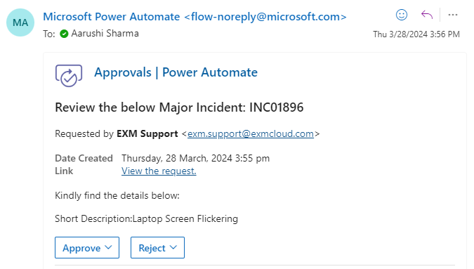 On Proposing a major Incident, an approval is sent to the Major Incident Team to either Promote or Reject the incident.