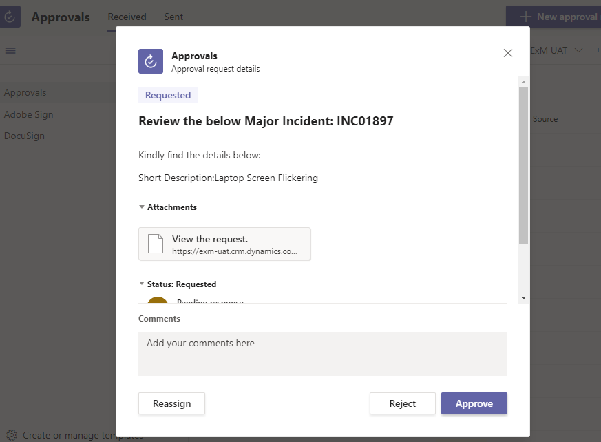 Once the Approval is granted, the Incident is upgraded to Major status and comments are logged; however, if rejected, it remains non-Major and updates to Rejected status with approver comments.