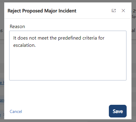 By clicking the button, a popup will appear, prompting you to provide a reason for rejecting the Major Incident.