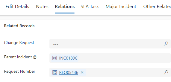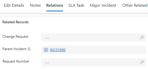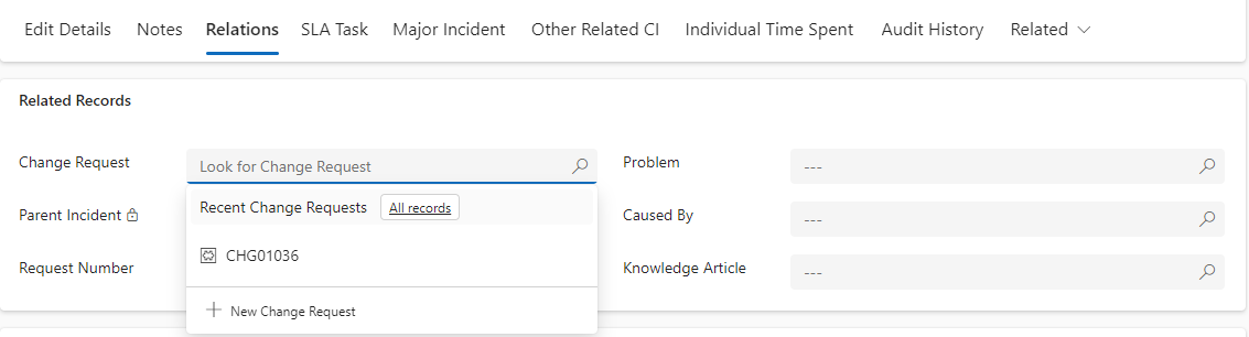 To add an already created change record to the incident, click on the Change Request field and add the Change Record.