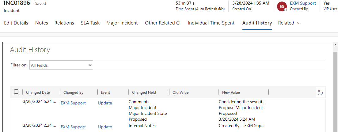 Any changes/updates made to the incident will be captured in the audit history tab. The person who made the changes will be captured along with the time and the updated fields.