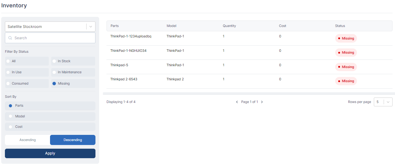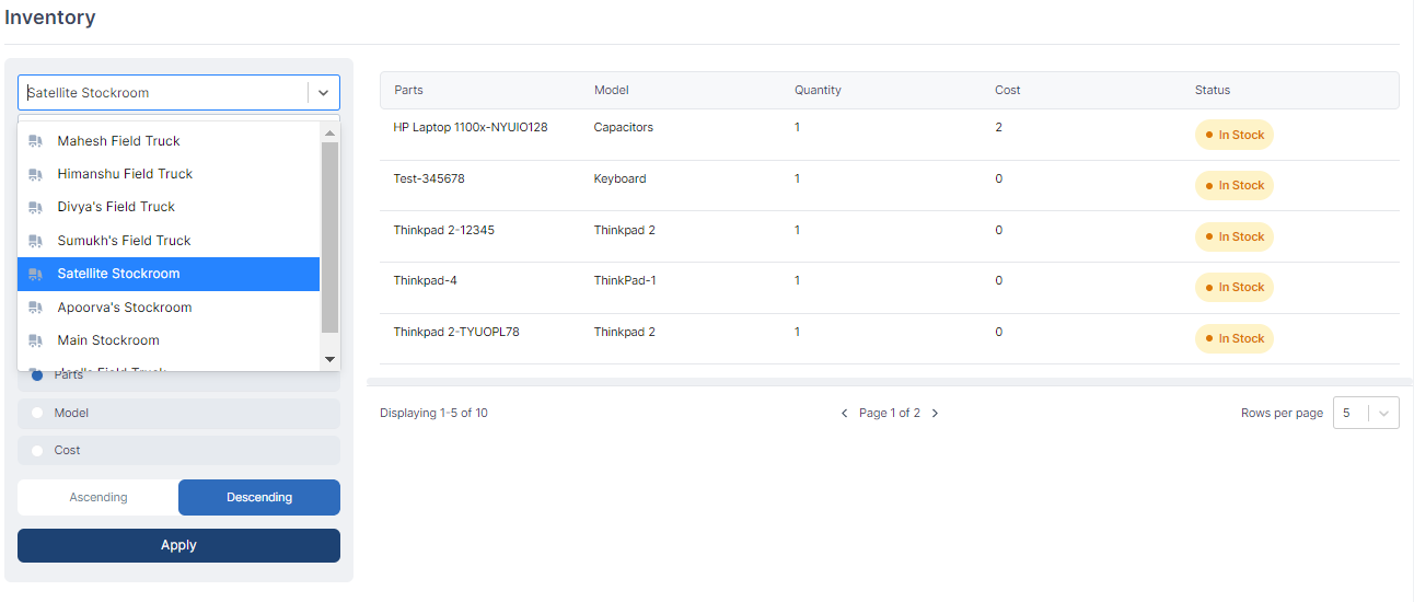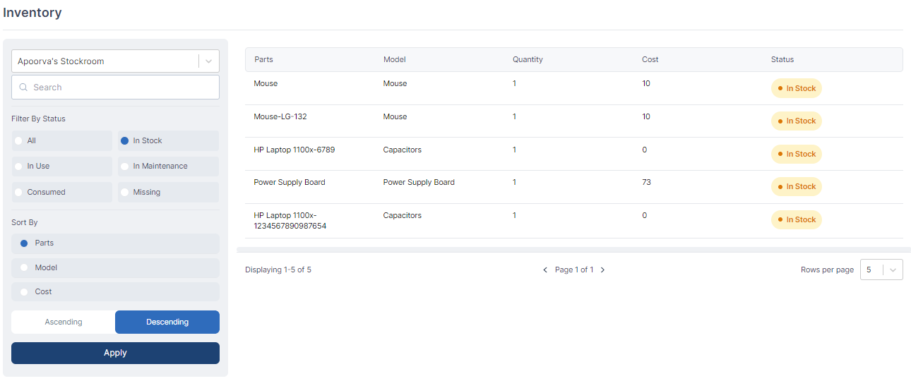 - Parts' Status Filter: With the status filter, you can refine the view based on the status of the parts in the inventory. This enables you to quickly identify items that are available, reserved, out of stock, or in any other defined status.