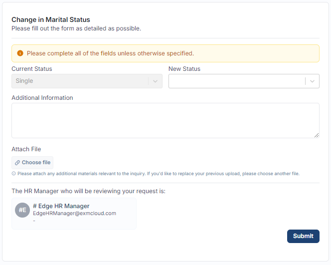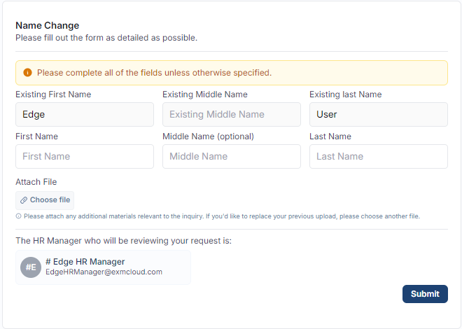 Ensure that the First Name, Last Name, and Attachment fields are completed as they are mandatory to submit the request. |