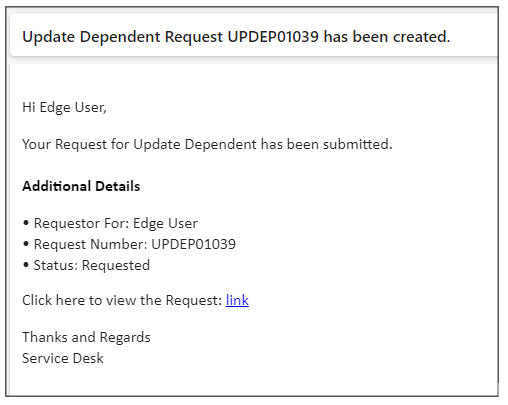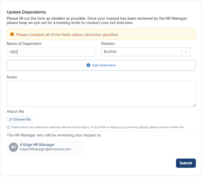 Review the details to ensure that the dependent information and attachment fields are completed. Click on the "Submit" button to initiate the dependent update request.