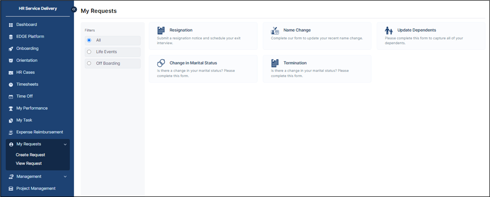 Click on the option for "Change in Marital Status". The page will open, displaying options for updating marital status. The system will automatically populate your current marital status from the system.