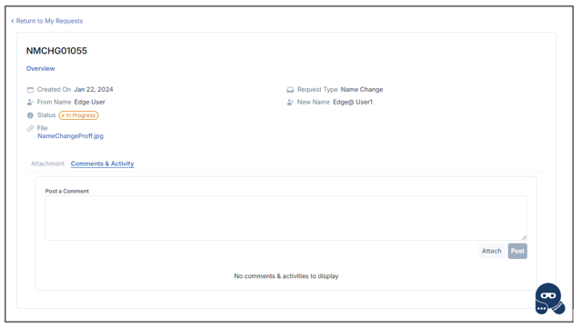Comments/Activity Tab: Under the "Comments/Activity" tab, users can add comments regarding the request. Attach additional files related to the request within the same tab.