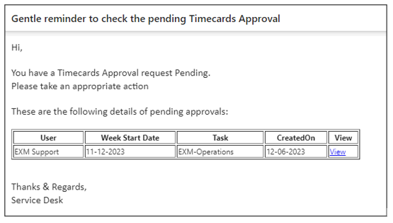 Email Reminder: An Email Pending timecard approval reminder notification will sent to the respective manger of the project.