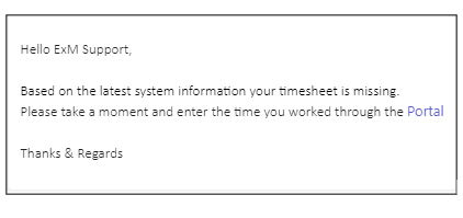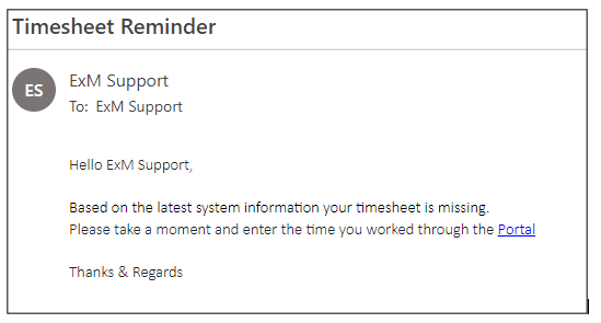 A User timesheet reminder is a written message prompting employees to track their time and submit their timesheets for a certain period of work. An E-Mail and Teams Reminder Notification will be sent to the Users and notify with a portal link.
