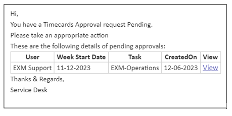 Teams Reminder: A Teams Pending timecard approval reminder notification will sent to the respective manger of the project