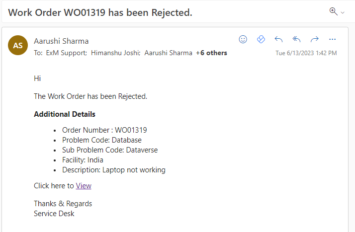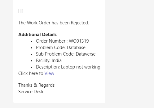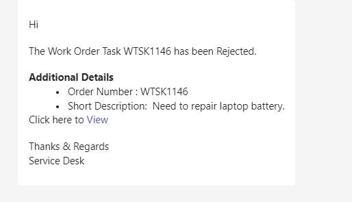 When a work order status is changed to “Rejected” a notification is sent to the Caller, Informed Users, Assignment Group and Dispatch Group on Outlook and Teams.