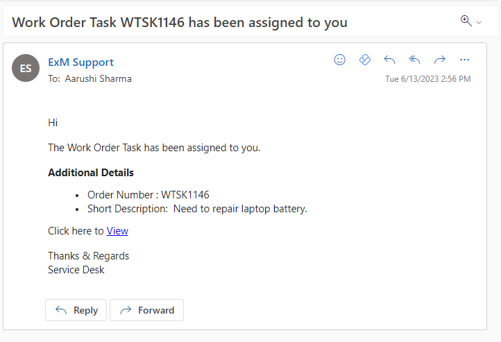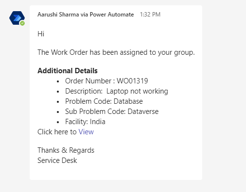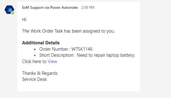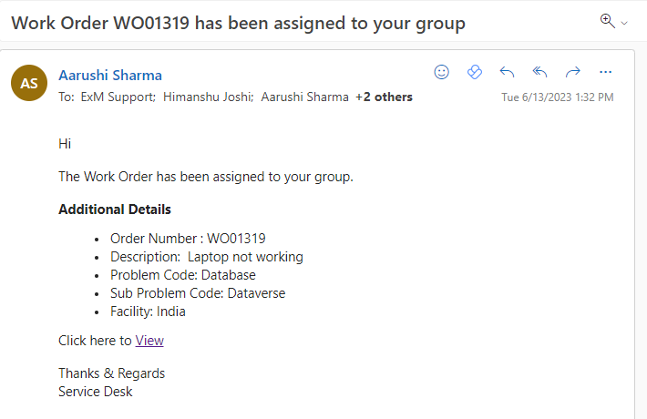 When a work order status is updated to “Assigned” a notification is sent to the Assignment Group on Outlook and Teams.
