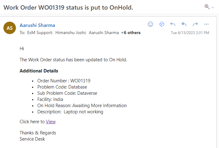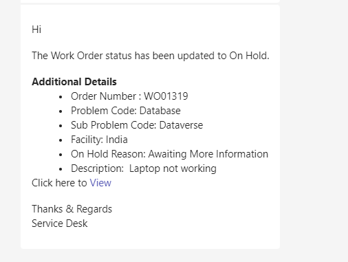 When a work order status is changed to “On Hold” a notification is sent to the Caller, Informed Users, Assignment Group and Dispatch Group on Outlook and Teams.