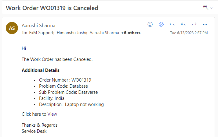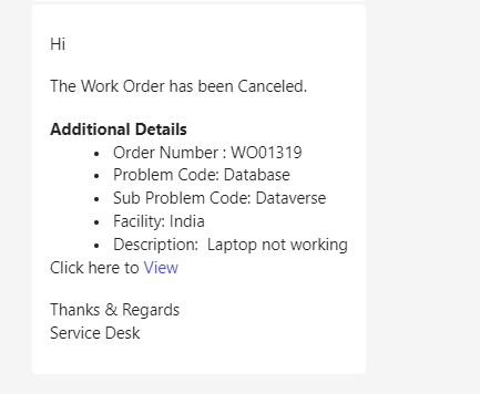 When a work order status is changed to “Canceled” a notification is sent to the Caller, Informed Users, Assignment Group and Dispatch Group on Outlook and Teams.