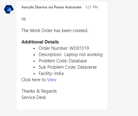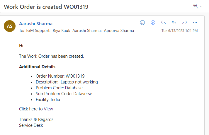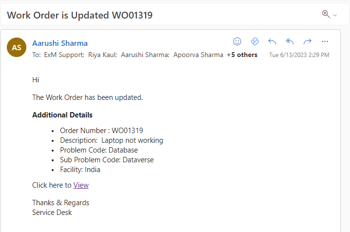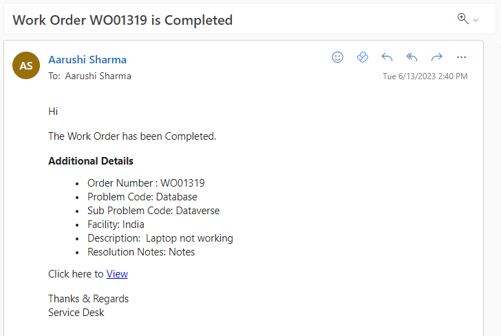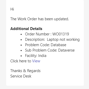 When a work order status is changed to “Completed” a notification is sent to the Caller, Informed Users, Assignment Group and Dispatch Group on Outlook and Teams and a feedback form is sent to the Caller over teams.